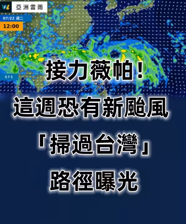 輕台薇帕這兩天從台灣南方海面通過,為東部、南部帶來強烈雨勢,預計在下周一(7/21)遠離,不過接下來持續到7月底、8月初,台灣都陷入季風低壓槽範圍,第7號颱風可能在下周一生成,預估路徑、對台影響也曝光了。