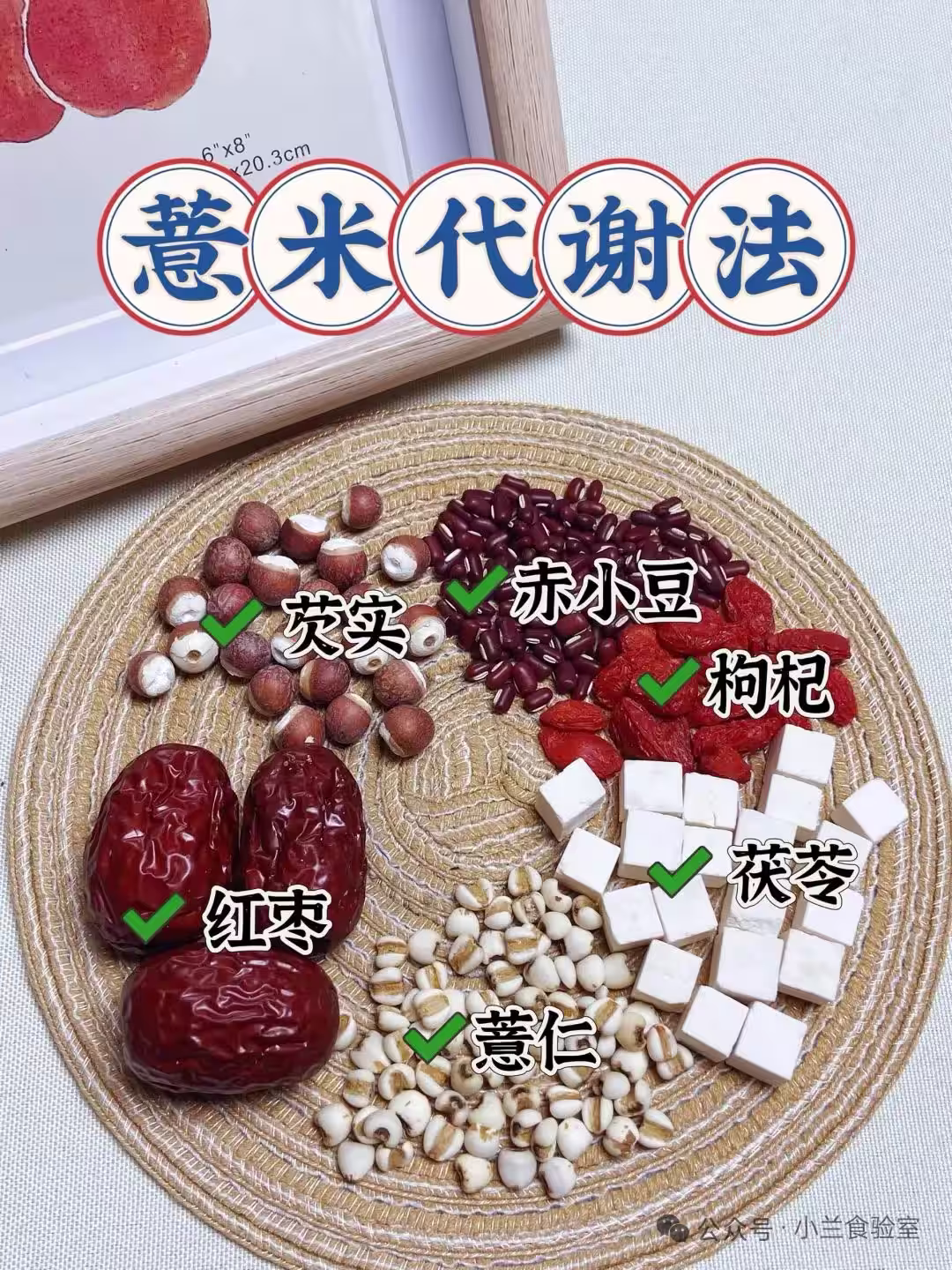 赤小豆18粒 薏米28粒 茯苓3-5顆 芡實18粒 枸杞8粒 紅棗1-2顆 清水1000ml