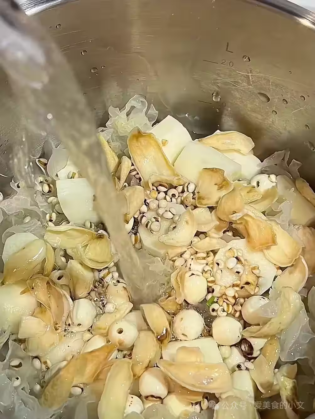 新鮮銀耳去芯,撕成小塊,和其他所有食材一起放進鍋里,加1.5升清水,大火燒開後,轉小火煮40分鐘就行。