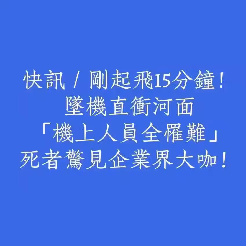 快訊/剛起飛15分鐘!墜機直衝河面「機上人員全罹難」...死者驚見企業界大咖