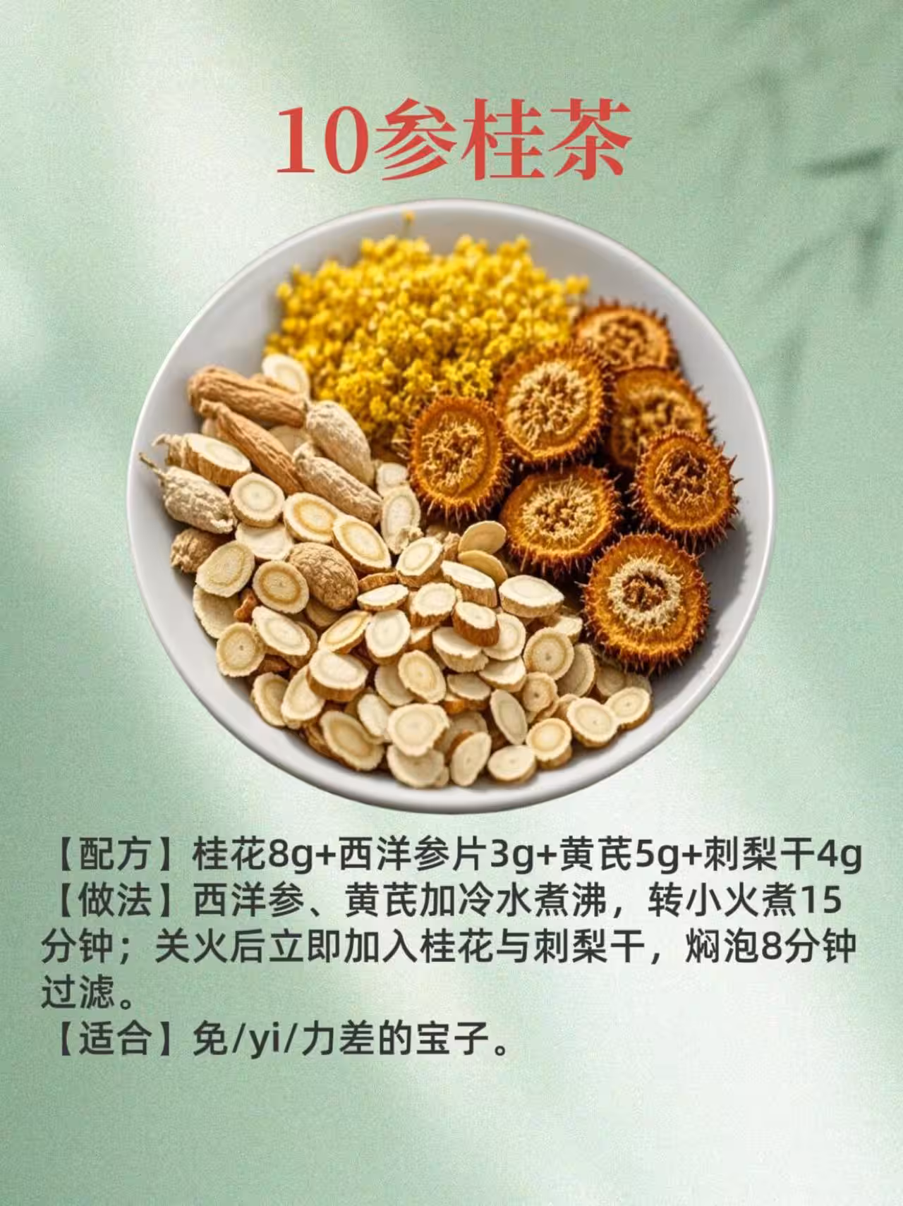 🌿參桂茶:免/疫/力差的寶子,試試這款參桂茶。桂花、西洋參、黃芪、刺梨乾,煮水燜泡,喝完身體棒棒噠,免/疫/力直線上升~