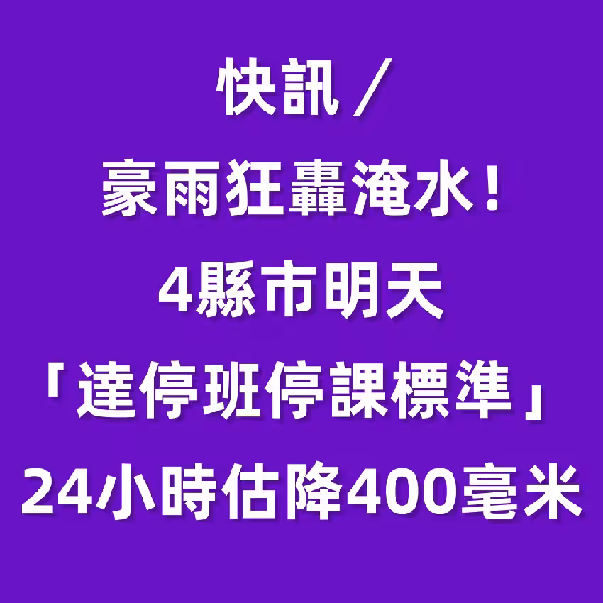 快訊/豪雨狂轟淹水!4縣市明天「達停班停課標準」 24小時估降400毫米