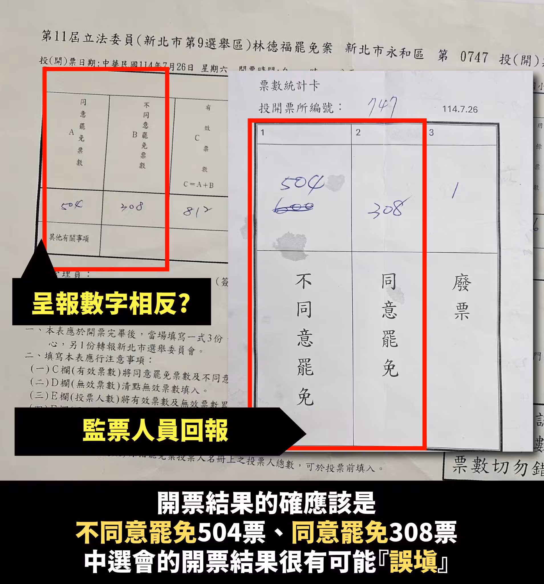 林德福表示,經過與內部監票員確認,當初的開票結果的確應該是不同意罷免504票、同意罷免308票,中選會的開票結果很有可能「誤填」,所以他們即刻就向選委會反映,希望能進一步查證,是否有誤填的情況,但卻反被選委會要求要「自行舉證」。