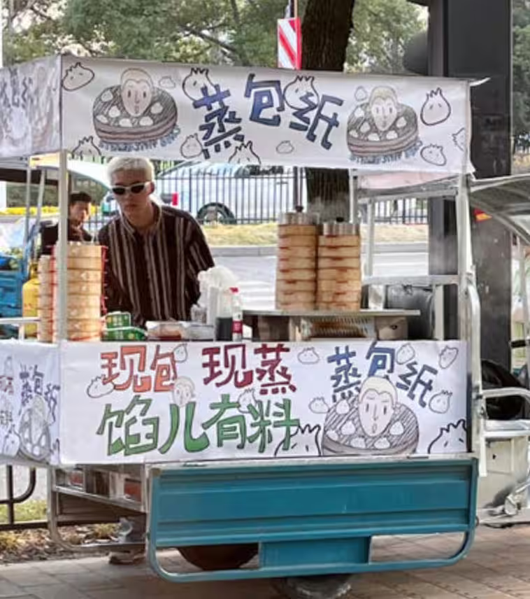 媒體也隨即附上爆料照片,只見一名穿著條紋襯衫的淺短髮男子,正站在一台寫有「蒸包紙/現包/現蒸/餡兒有料」等字的攤位前,專心叫賣。