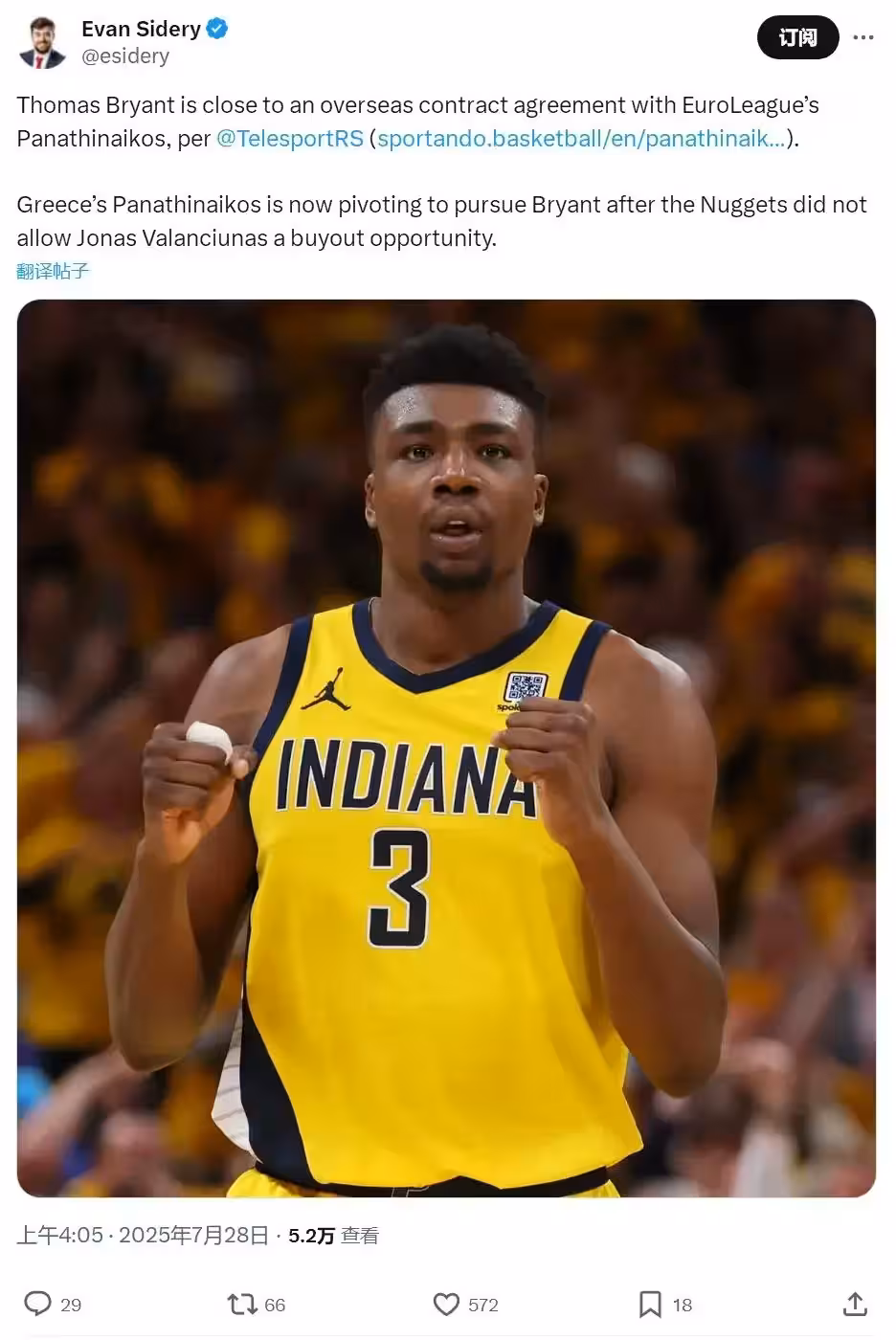 7月28日,又一個球員離開NBA,他就是托馬斯-布萊恩特。據歐洲媒體報道,希臘豪門帕納辛奈科斯隊將簽下托馬斯-布萊恩特,年薪300萬美元。帕納辛奈科斯此前追逐瓦蘭,但掘金拒絕放人,如今托布成了瓦蘭的替代者。