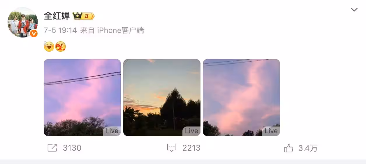 全紅嬋上一次更新國內社媒還是在7月5日,當時她發了幾張家鄉夕陽的照片。