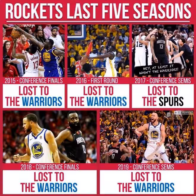 他面對庫里的樣本這麼大,打了20場一共就贏了6場,這才是真正的見著庫里就害怕。而且整個職業生涯,哈登5次被庫里無情的淘汰回家,用不同的方式帶領火箭隊倒在了勇士隊手上。10年抗勇路,4次輸輸輸,這才是一生之敵。