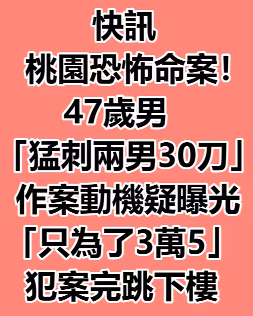 快訊/桃園恐怖命案!47歲男「猛刺兩男30刀」 作案動機疑曝光「只為了3萬5」犯案完跳下樓