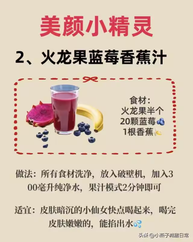 適合:熬夜臉蠟黃、皮膚暗沉的姐妹!火龍果的花青素+藍莓的抗氧化,喝一周臉蛋子嫩得能掐出水,素顏都敢出門!