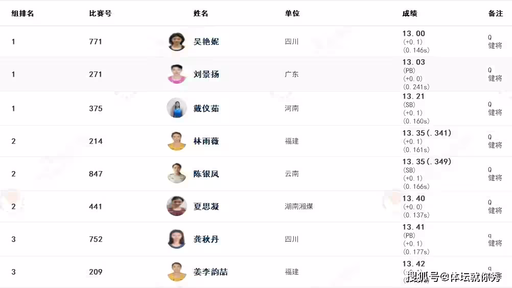 13秒00!吳艷妮排名第一,直接跑出無人區,冠軍穩了,夏思凝林雨薇晉級