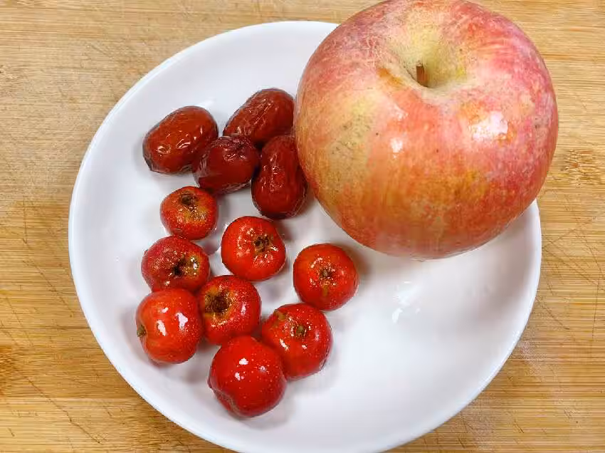 【山楂蘋果湯】 所準備的食材有:山楂適量、蘋果一個、冰糖、紅棗4顆具體做法: