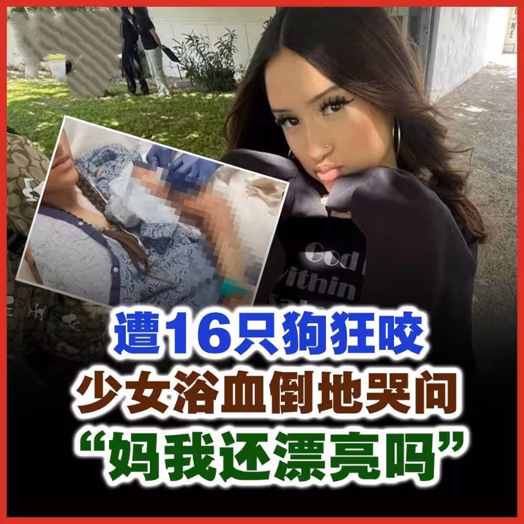 (聖迭戈綜合電)美國加州一名17歲少女在外頭慢跑時,遭到16隻狗圍攻狠咬,差點因而喪命,母親趕到現場那一刻,幾乎認不出親生女兒,當時受傷嚴重的少女看到媽媽,哭著問她「媽媽,我還漂亮嗎?」,母親只能忍能眼淚回答「當然,你一直都很美」。