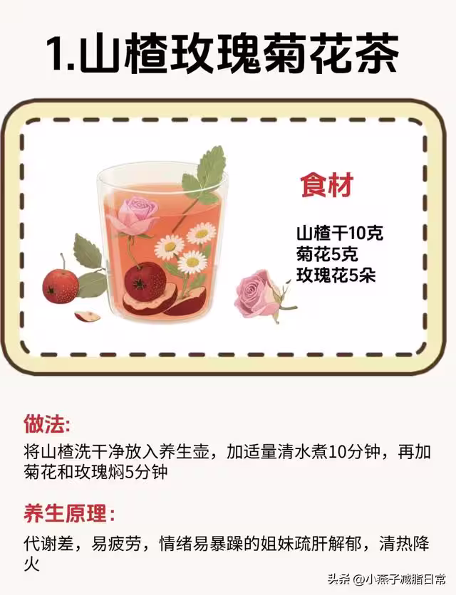 做法:山楂洗乾淨放進養生壺,加適量清水煮10分鐘,再放入菊花和玫瑰燜5分鐘就行。