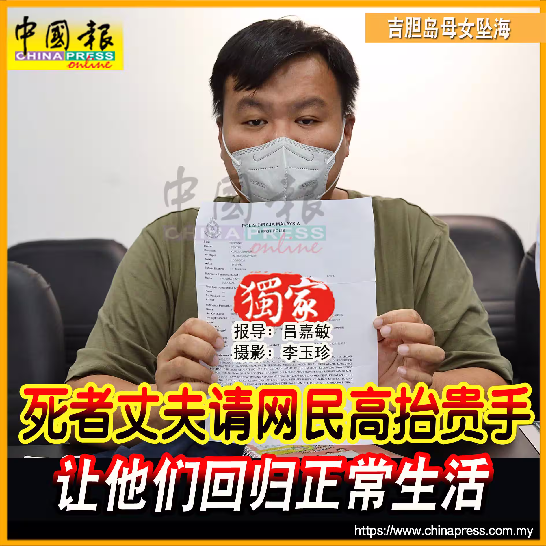 (吉隆坡11日訊/獨家報導、攝影)「吉膽島碼頭母女墜海亡」案;死者丈夫促請肉搜他們一家人的網民,能高抬貴手放過他們,讓他們得以回歸正常生活!