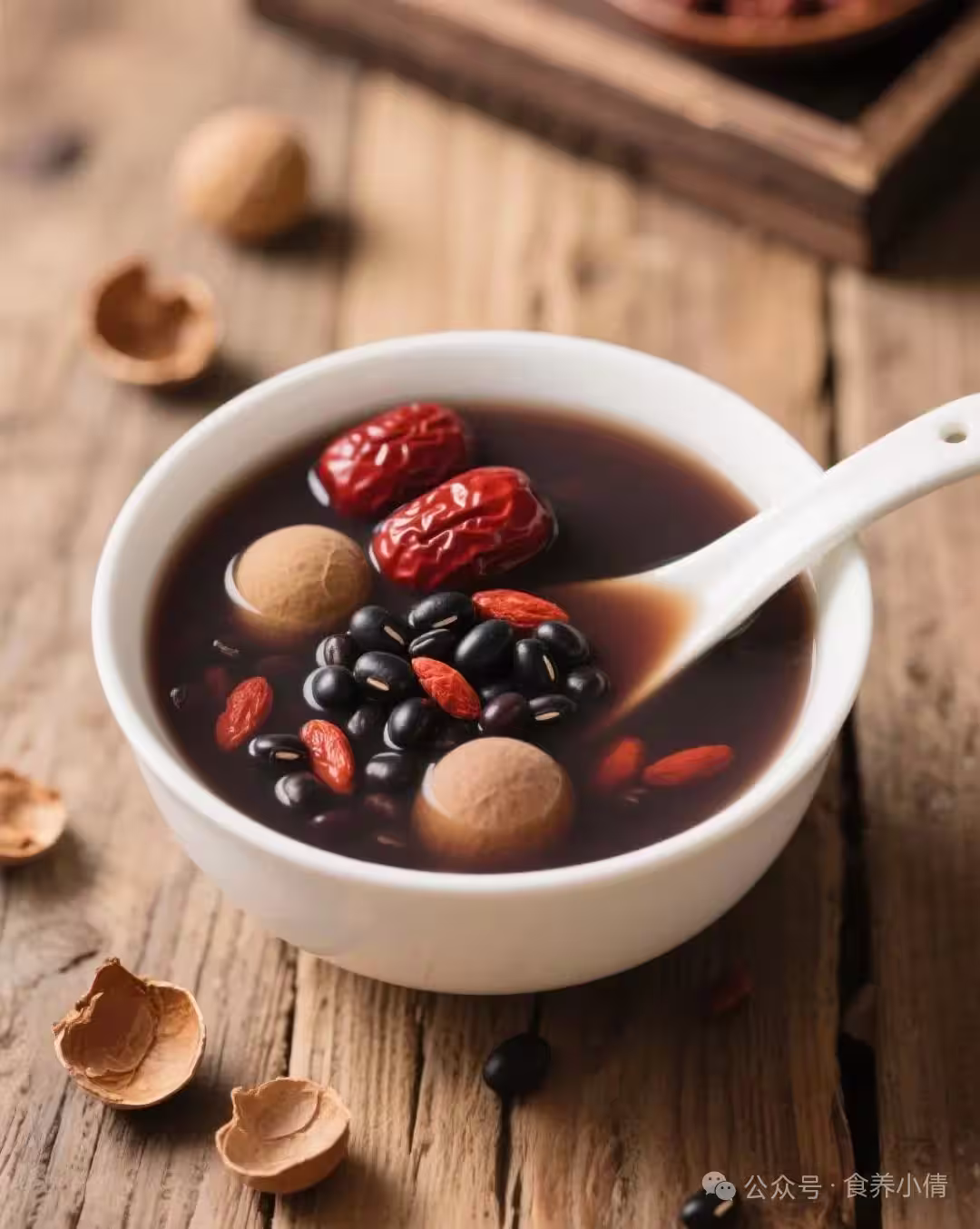 食材:黑豆50克、紅棗5顆、桂圓10克、枸杞5克、清水800毫升