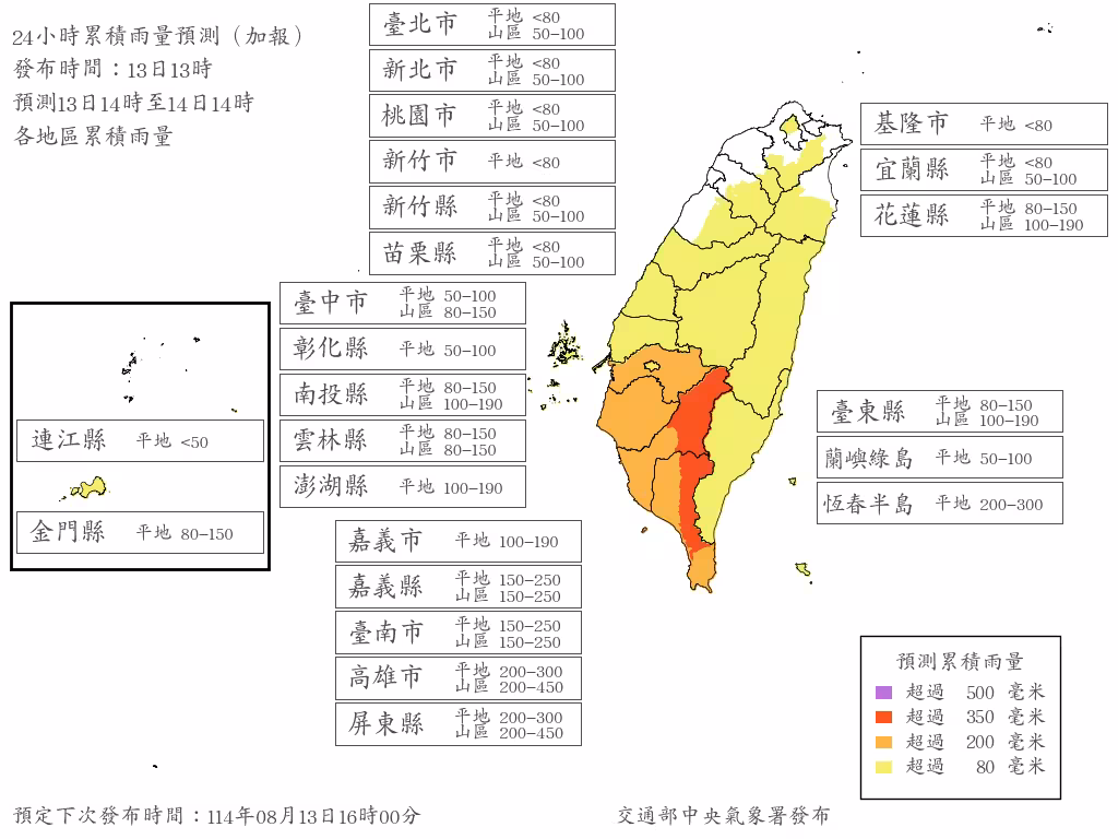 中央氣象署今(13日)下午1時公布楊柳颱風最新風雨預報,明天(14日)凌晨0時至上午6時雲林縣濱海鄉鎮、嘉義縣濱海鄉鎮、台南市濱海鄉鎮、高雄市濱海鄉鎮、金門縣及澎湖縣風力達到停班課標準。另外,今天下午2時至明天下午2時嘉義縣山區、高雄市山區及屏東縣山區雨量也達標。