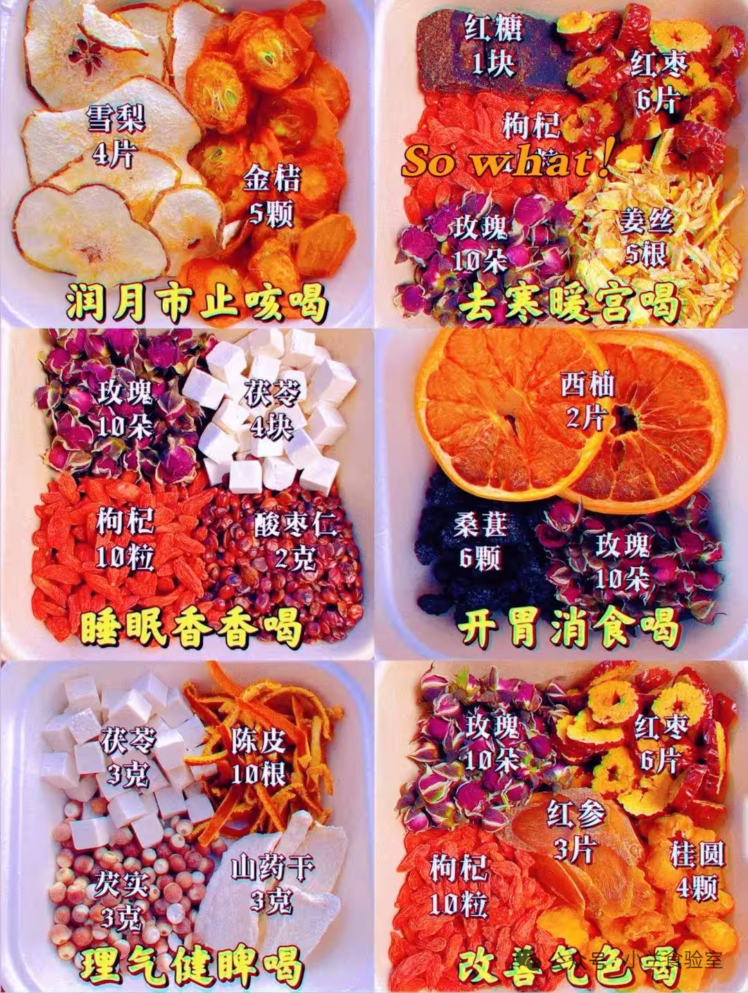 配方:重瓣紅玫瑰3g(約10朵)、紅棗干6g(約6片)、紅參片1g(約3片)、枸杞5g(約10粒)、桂圓乾4g(約4顆)