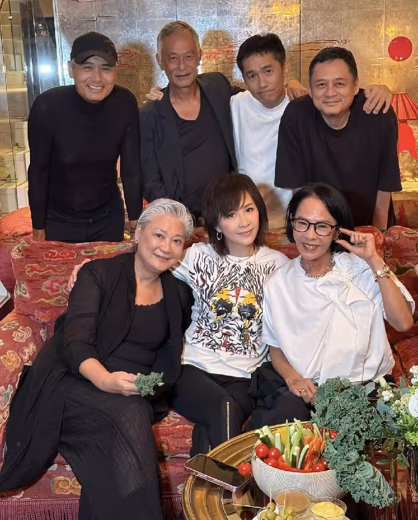 合照中,三個女性坐在沙發上,劉嘉玲坐在中間,杜琪峰的太太以及周潤發的太太坐在兩邊,而四位男性站在後排。
