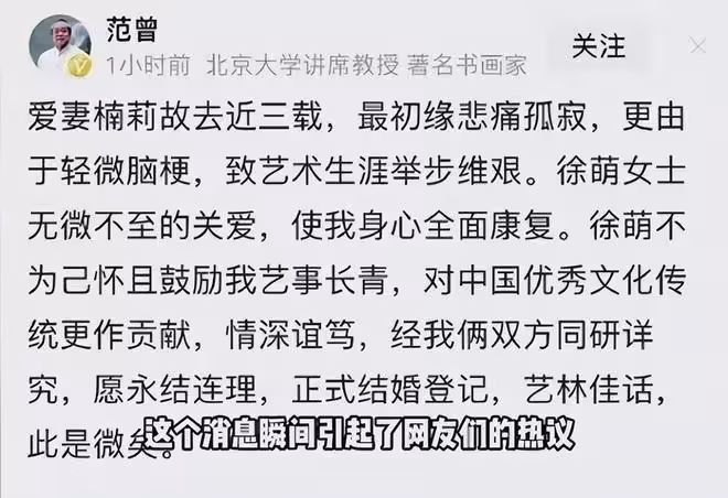 要知道,范曾和徐萌是在2024年4月結婚的,當時范曾還在自己的社交平台上特意官宣,並寫下一段對妻子極度認可的話。