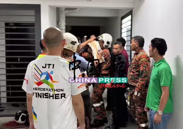 林立迎(左)陪伴想不開的華裔男子談心,消拯員則趁男子被轉移注意力時,將人踹進公寓內;右為賴俊權。