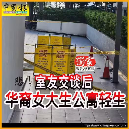 (吉隆坡20日訊/獨家報導)華裔女大學生疑一時想不開,今日清晨從公寓22樓墜下,當場身亡!