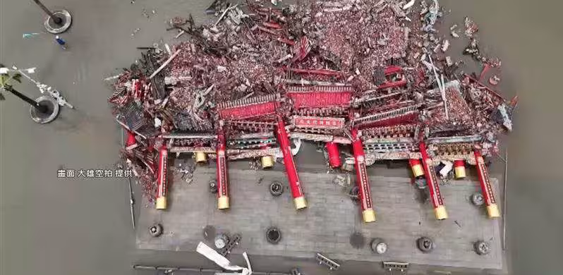台南南鯤鯓代天府牌樓,丹娜絲颱風過境崩坍成廢墟,事隔40多天,殘破磚瓦還有12根千年檜木初步整理收拾,估計要花2億元才能重建門面,台北有宮廟為了幫忙,捧著千萬現金,堆疊成小山,搬到廟宇大殿,要助重建一臂之力。