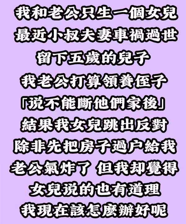 我和老公只生一個女兒,最近小叔夫妻車禍過世留下5歲兒子...我老公打算領養侄子「說不能斷他們家後」!結果我上大學的女兒跳出反對:「除非先把2間房子過戶給我!」老公氣炸了...但我卻覺得女兒說的也有道理,我現在該怎麼辦好
