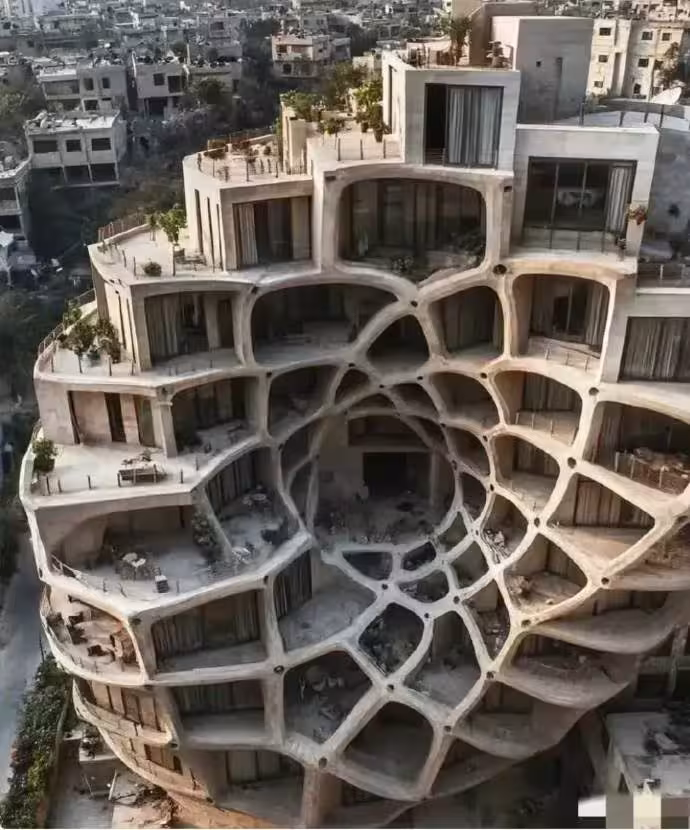 這些「蜂窩房」以其獨特的外形,成為了城市中的一大地標。建築外立面呈現出蜂窩狀的結構,空隙處猶如一個個小小的單元,每個房間都由複雜的曲線和斜面組成。無論從哪個角度觀察,它都不像是傳統意義上的住宅,更像是某種實驗性的藝術作品。