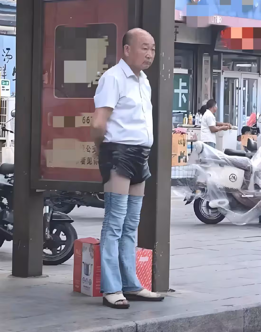 夏末秋初的午後,陽光依然炙熱,城市的商業街上人流如織。突然,一股異樣的騷動在人群中蔓延,人們的目光像被磁石吸引一樣,聚焦在一位行為古怪的老人身上。他成了一道令人費解、甚至有些刺眼的「風景」。上身是一件洗得發黃、卻依稀能辨出原本是白色的短袖襯衫,紐扣錯位地扣著,下擺一半塞著,一半耷拉著。而他的下半身,則是一場徹底的「視覺災難」:一條緊身的黑色皮短褲緊繃在腿上,外面古怪地套著半條被裁切的、毛邊參差的牛仔褲筒。腳上,一雙沾滿塵土的塑料涼鞋,露出了他粗糙的腳趾。他頭眼神空洞而迷茫,對周遭投來的目光毫無反應,只是不停地拉扯著那半截牛仔褲,嘴裡念念有詞,在街頭漫無目的地徘徊。