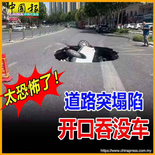 目擊市民發布的影片顯示,事發處馬路為柏油路面,塌陷的地方出現一個大洞口,一輛白色越野車側翻陷在洞內,現場有工作人員正在設法吊運裡面的汽車。