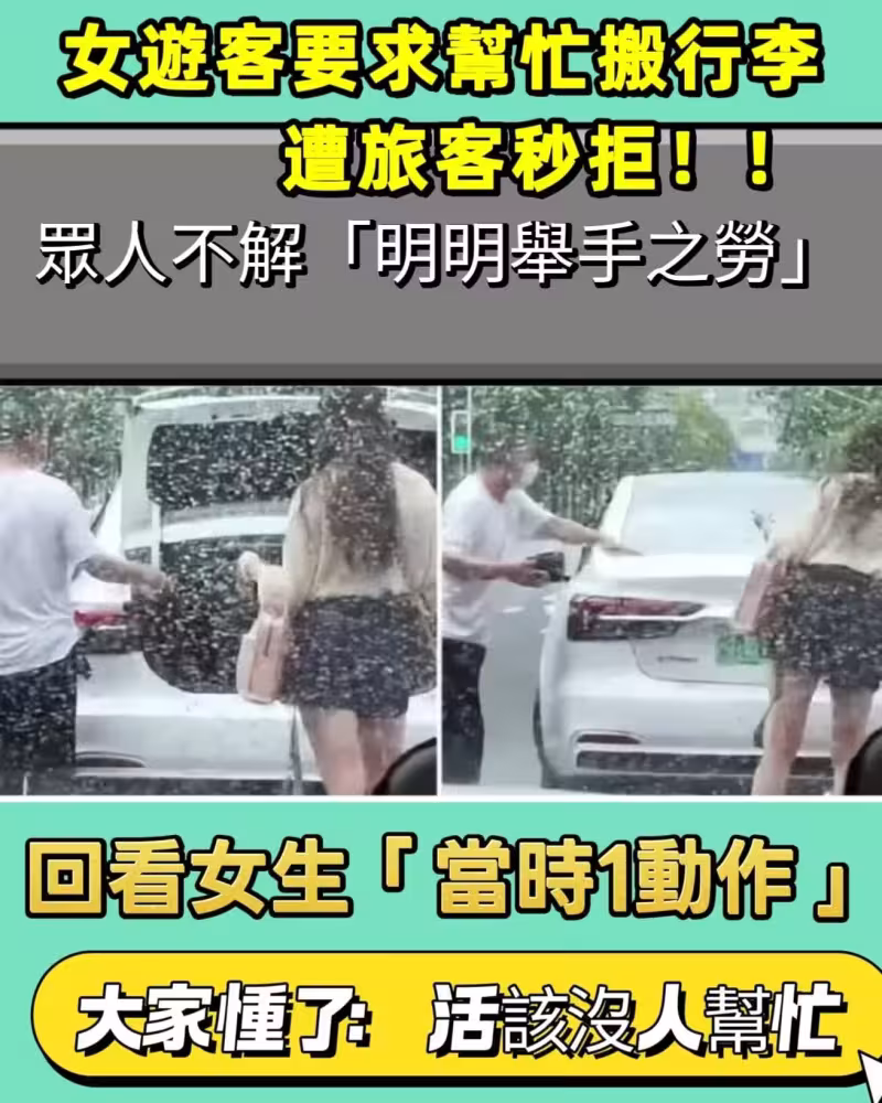 畫面中,一位短裙女子站在叫車後車箱旁,期待司機幫她搬行李,但司機似乎並無此意,直接將後備蓋蓋「啪」地一關,轉身離開。