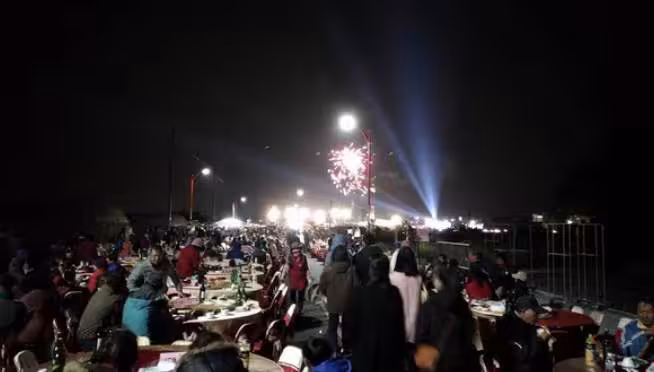 從畫面中可以看到,寬敞的馬路被擺滿圓桌,中央更搭建一個小型舞台,宛如演唱會規格,新人的照片還被擺在左右兩邊,簡直是場世紀婚禮。