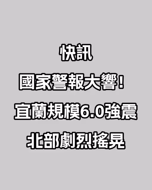 快訊/國家警報大響!宜蘭規模6.0強震 北部劇烈搖晃
