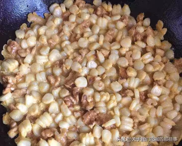 3、起鍋倒入少量油,燒熱後倒入核桃仁玉米粒,用鏟子壓平,小火煎2分鐘,煎至定型。再淋入適量油,煎至顏色金黃後出鍋,根據個人口味撒上白糖或食鹽,其實原味也非常好吃。