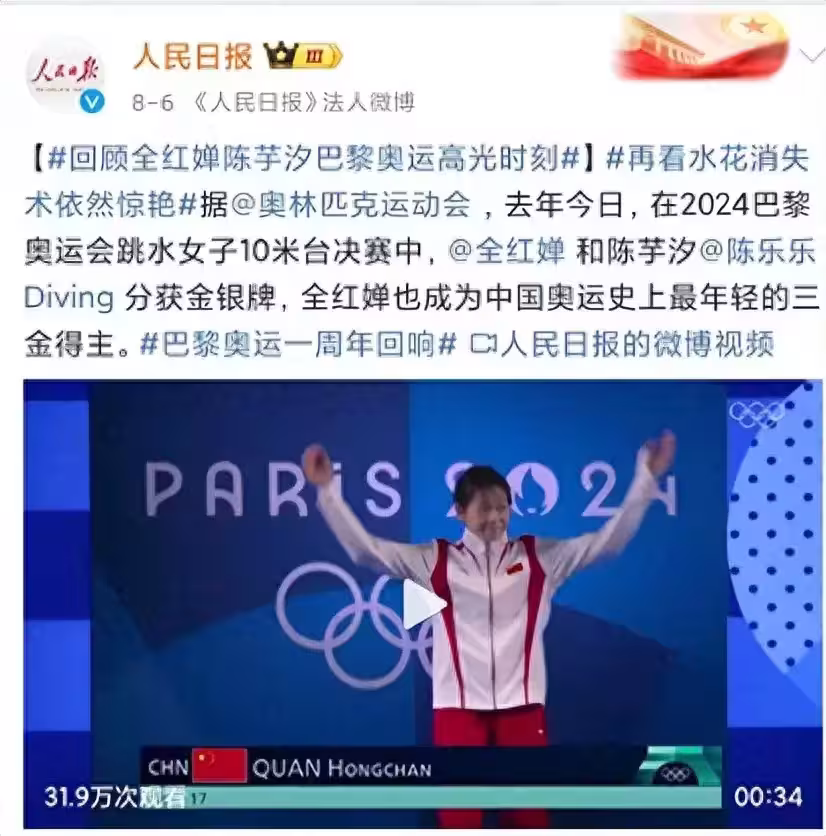 8月1日,「央媽」親自下場為全紅嬋闢謠,打擊那些用AI仿冒她聲音帶貨的不良商家;8月6日,又發文回顧了去年巴黎奧運會上的高光時刻;8月11日到12日,《人民日報》更是兩天連發3條動態,條條艾特全紅嬋。