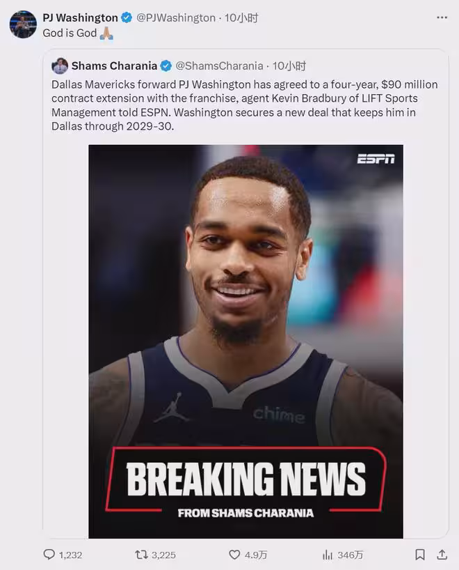 9月4日,獨行俠官方宣布:球隊跟PJ-華盛頓簽下4年9000萬美元的續約合同。這是現階段華盛頓能拿到的最大合同,獨行俠沒有壓價,展現了足夠的誠意。華盛頓現有合同3年4650萬,2026年夏天到期,還剩1年1415萬。