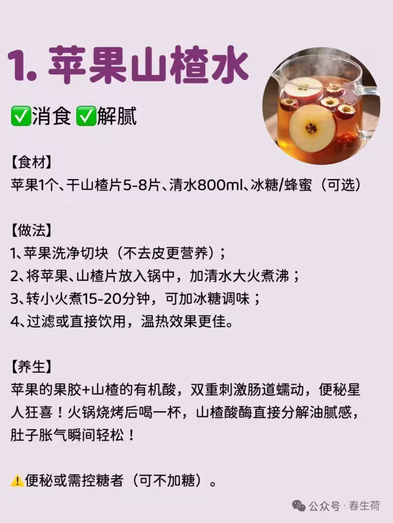 蘋果洗凈切塊(不去皮),和干山楂片放入鍋中,加 800ml 清水大火煮沸,轉小火煮 15 - 20 分鐘,可加冰糖調味,過濾或直接飲用,溫熱效果更佳。