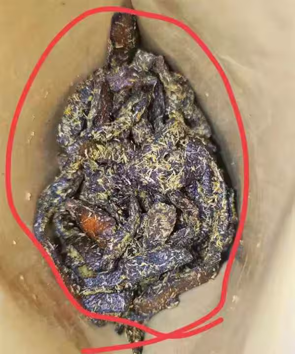 盒子裡裝著深褐色、看起來黏糊糊的片狀物,上面還撒滿了紅色粉末,看起來像是發霉了似的。
