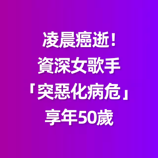 凌晨癌逝!資深女歌手「突惡化病危」享年50歲 昔勇敢「公開坎坷經歷」丈夫悲慟:趕去還是來不及
