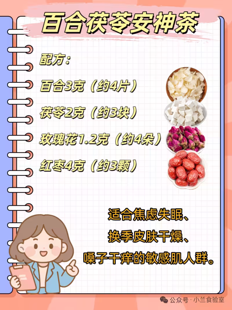 百合潤肺,茯苓健脾,玫瑰活血。喝完臉蛋自帶柔光,睡眠質量飆升!適合焦慮失眠、換季皮膚乾燥、嗓子干癢的敏感肌人群。