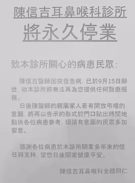 消息一出,外界都相當不舍,前來Google Maps留言,「上學的路上都會路過這間診所,小時候也去過很多次,沒想到今日聽聞噩耗,謝謝您為大家治病,辛苦了,一路好走!」、「謝謝陳醫生對孩子們的照顧!RIP」、「謝謝陳醫師的奉獻」、「從小看到大,聽到這消息直接嚇到」、「謝謝陳醫師為無數病人恢復健康,侄子每次來看醫生都特別跟他聊上好幾句像朋友一樣,謝謝您,辛苦了!在另一個要世界好好休息喔」、「搬來中和後,一直都是看陳醫生,謝謝你,一路好走」、「感謝陳醫生總是那麼親切詳細的問診,願您在另個世界一切安好。