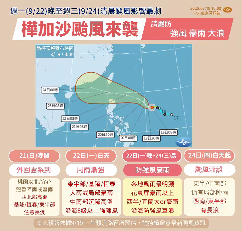 根據《三立新聞網》指出,即便核心不直撲台灣,台灣南端陸地還是會被暴風圈掃過,首當其衝的恆春,嚴防強風大雨東半部、全台山區也會有豪大雨出現。