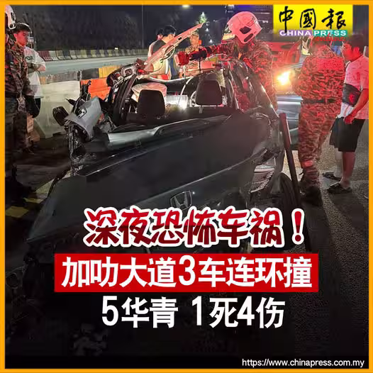 (吉隆坡23日訊)3輛轎車凌晨發生連環撞,造成5名華裔青年,1死4傷!