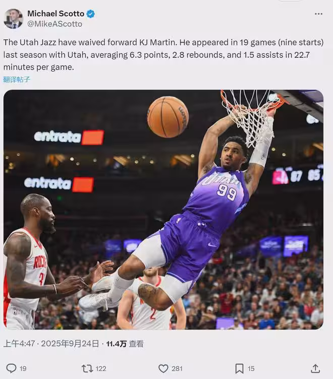 也就是說,此次爵士裁掉小馬丁,不需要付出任何代價。2024年夏天,小馬丁2年1600萬美元跟76人續約。今年2月份,76人把小馬丁和2個次輪簽送給活塞,直接省下2000多萬美元的奢侈稅。活塞也沒留他,很快將其送給爵士。