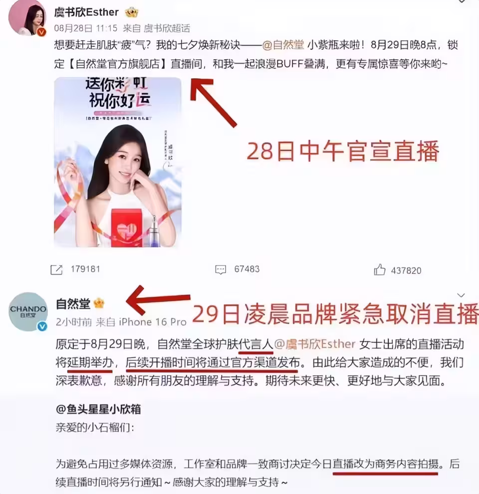 而且有杭州的網友說,當時杭州不少商場的自然堂專櫃,連夜把虞書欣的櫥窗海報給撤了,早上路過的時候還能看到工作人員在撕殘留的貼紙。
