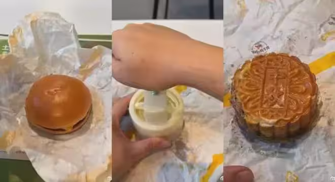 新一代消費者們不再執著於餡料本身,而是拿起傳統月餅模具,將漢堡、蛋黃派、豆沙包等各種各樣與月餅八竿子打不著的食物硬塞進去,壓成那枚圓潤、刻花的「月亮形狀」。「一分鐘製作月餅」引來八方點贊。