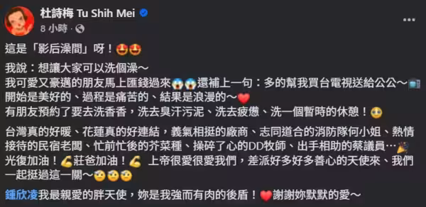 這次的救災行動讓杜詩梅深受感動,她特別讚揚台灣人的互助精神:「義氣相挺的廠商、志同道合的消防隊何小姐、熱情接待的民宿老闆、操碎了心的DD牧師、出手相助的蔡議員」,每個人都積極投入救援工作。她更感謝好姐妹鍾欣凌的傾力相助,暖心寫下:「你是我最親愛的胖天使,是我強而有肉的後盾!謝謝你默默的愛~。」