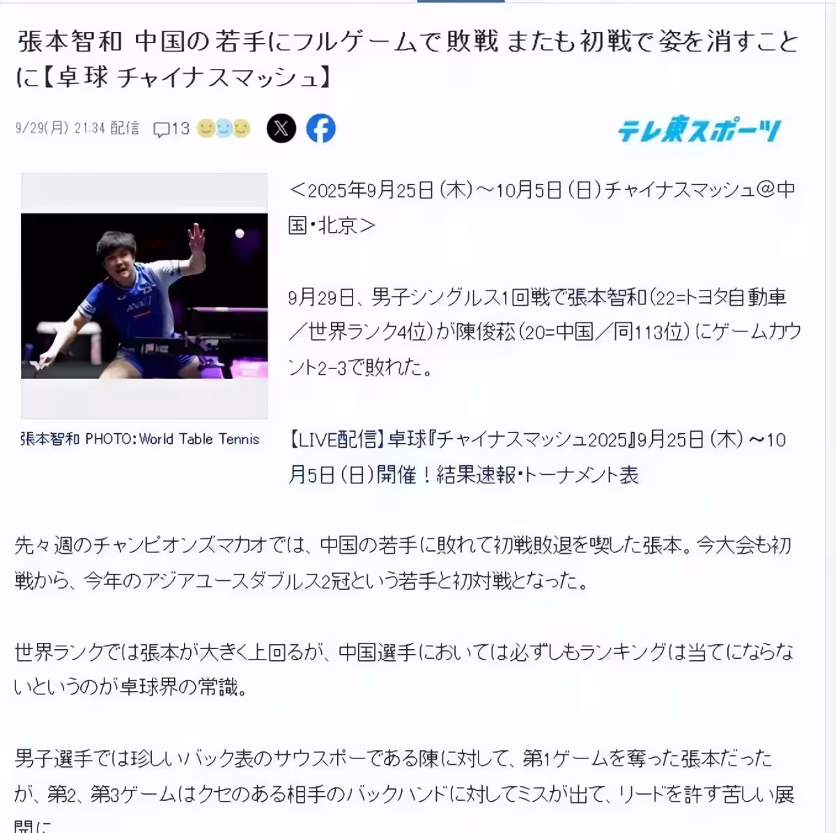 張本智和一輪游出局後,日媒居然這樣評價:國乒實力不能看排名
