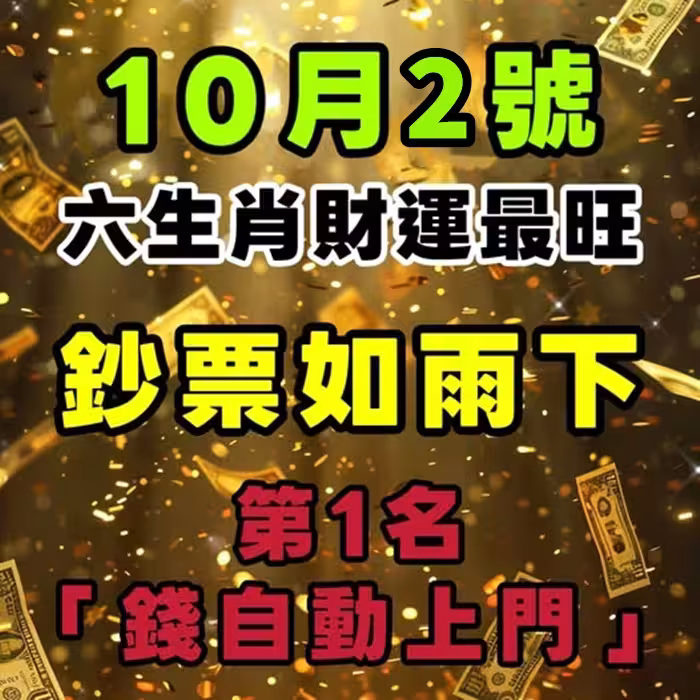 【10月2日】六生肖財運最旺 ,鈔票如雨下!第一名「 錢自動上門 」