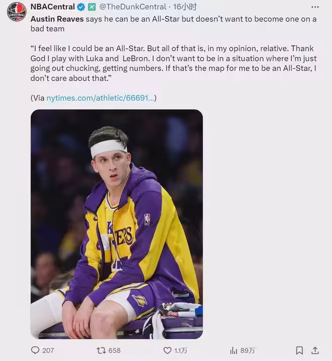 10月1日,距離常規賽揭幕戰還有21天。湖人後衛里夫斯接受採訪時說道:「我覺得自己完全有能力入選全明星,但我不想靠刷數據進全明星。我不想處在那種只能不斷出手、只能刷數據的環境,那樣的全明星我根本不在乎。」